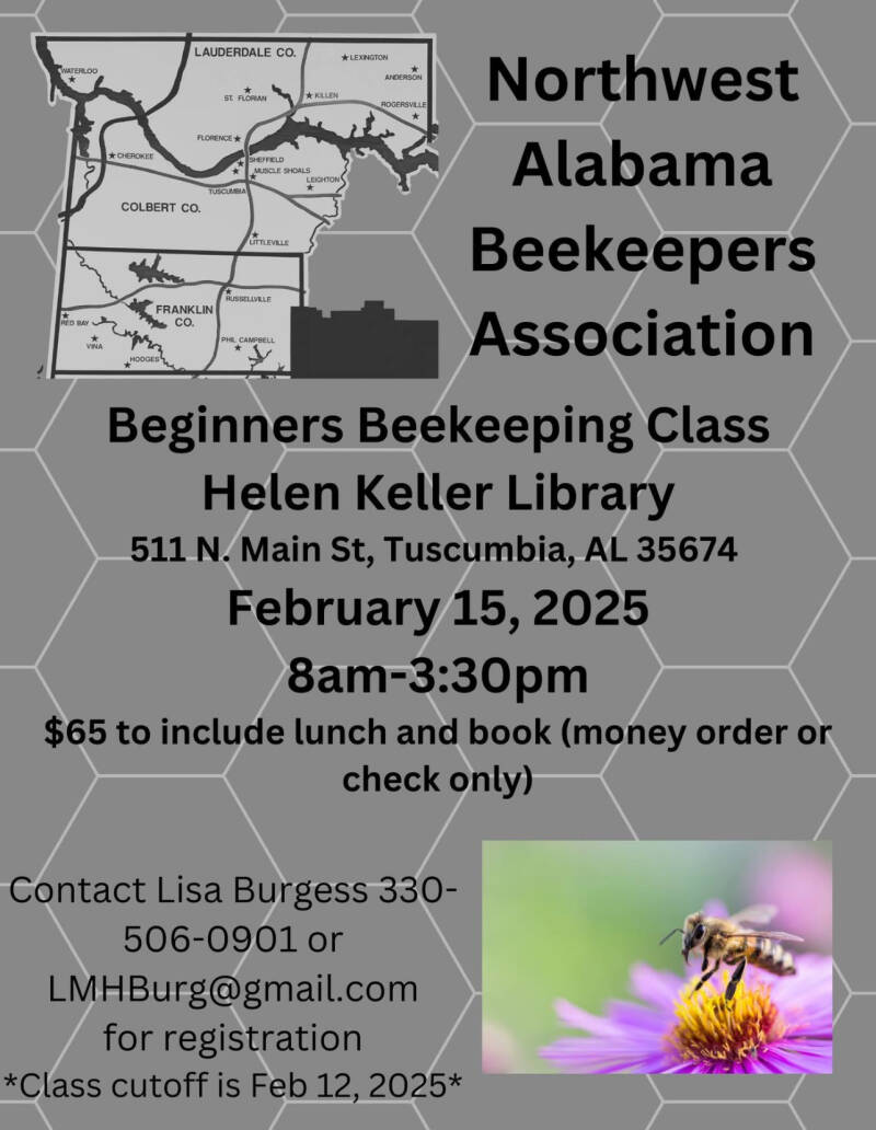 The Northwest Alabama Beekeepers Association is hosting a beekeeping class on Saturday, February 15, 2025. The class will be at the Helen Keller Library 511 N. Main Street, Tuscumbia, AL from 8am til 3:30pm. The cost of the class is $65 per person and includes lunch and a book.